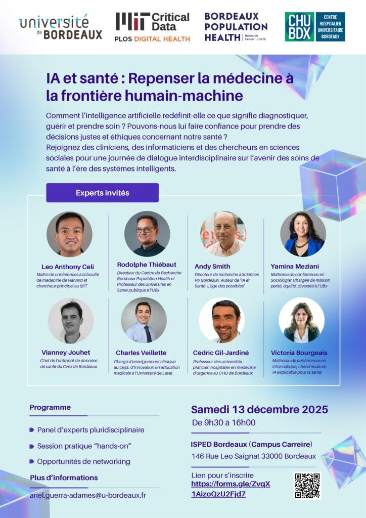 Le Bordeaux Population Health Research Center en collaboration avec le MIT Critical Data, PLOS Digital Health et le CHU de Bordeaux, organisent, le samedi 13 décembre 2025 à l’ISPED, un atelier pluridisciplinaire sur l’IA et la santé : “Repenser la médecine à la frontière humain-machine”