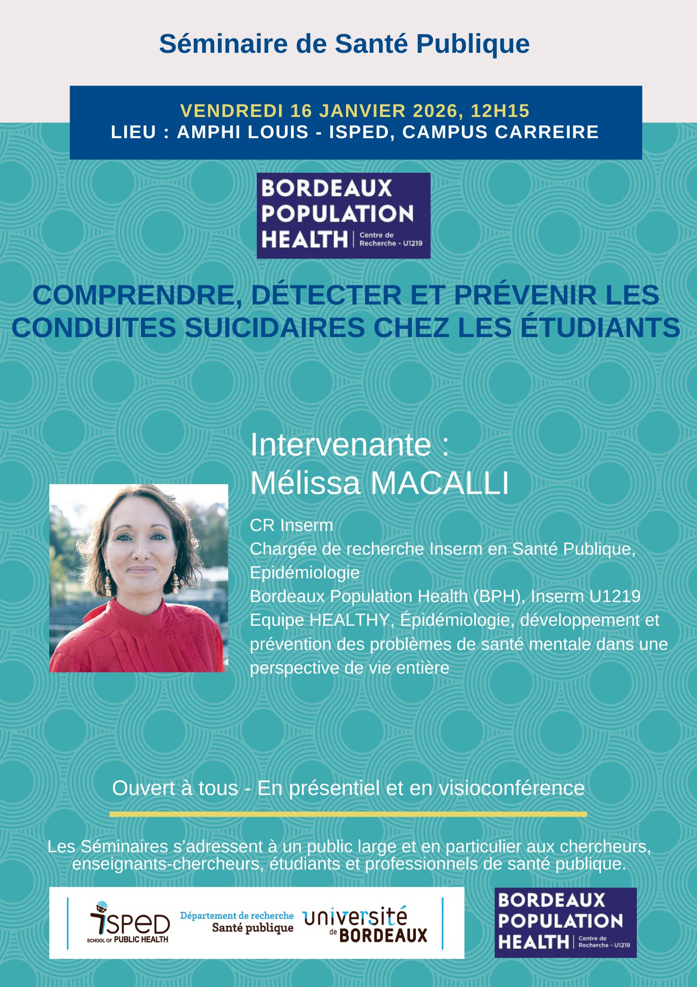 (Épidémiologie, développement et prévention des problèmes de santé mentale dans une perspective de vie entière) du Bordeaux Population Health qu’elle co-dirige. Elle s’intéresse en particulier à la compréhension, la détection et la prévention des conduites suicidaires chez les étudiants.