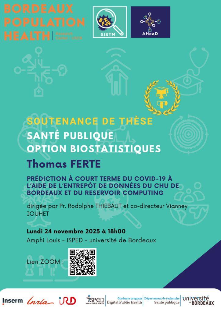 RetourThomas FERTE soutiendra sa thèse en santé publique – option biostatistiques réalisée sous la direction du Pr. Rodolphe THIEBAUT et co-directeur Vianney JOUHET :
