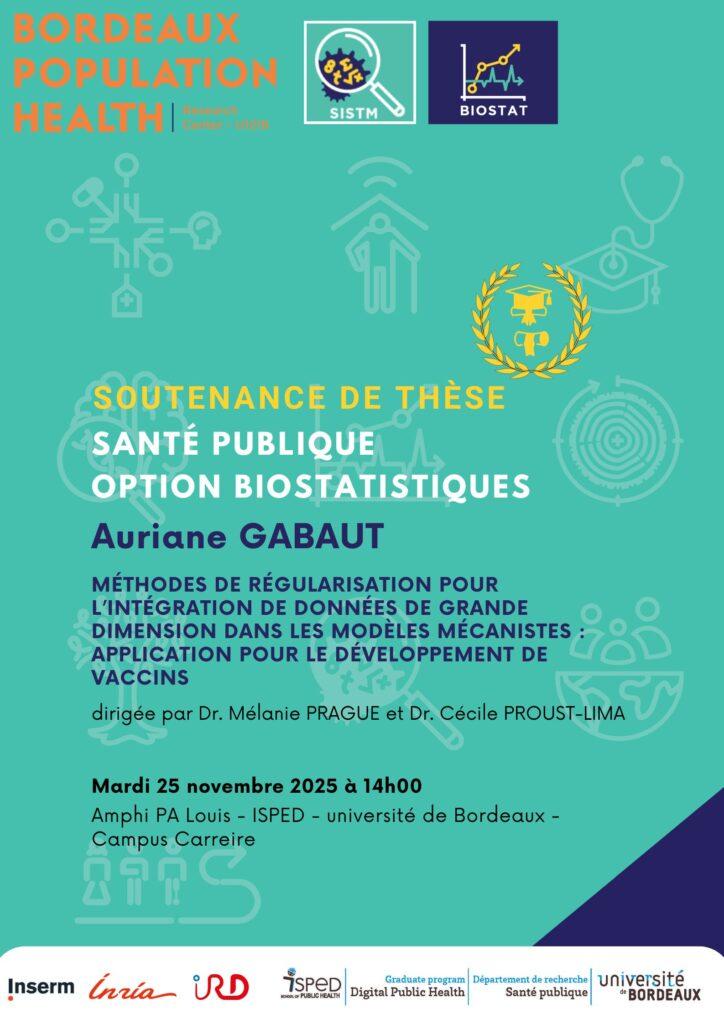 Auriane GABAUT soutiendra sa thèse en santé publique – option biostatistiques réalisée sous la direction du Dr. Mélanie PRAGUE et Dr. Cécile PROUST-LIMA intitulée :