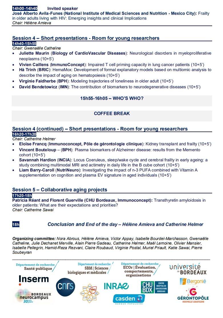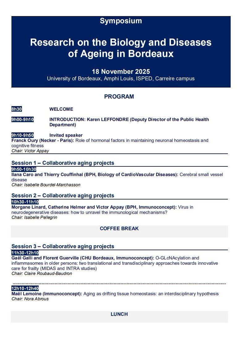This symposium is an opportunity to bring together researchers, clinicians, doctoral students, post-doctoral students and healthcare professionals from Bordeaux to present and discuss advances, compare perspectives and work together to explore new challenges of ageing research in a collaborative approach.