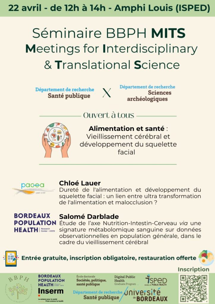 The MITS seminars aim to promote interdisciplinarity among young researchers at the University of Bordeaux. Each session brings together one young researcher from the Department of Public Health and one from another Bordeaux-based research department, followed by an informal discussion over a buffet. These seminars take place every fourth Wednesday of the month, from 12:00 PM to 2:00 PM, in person.